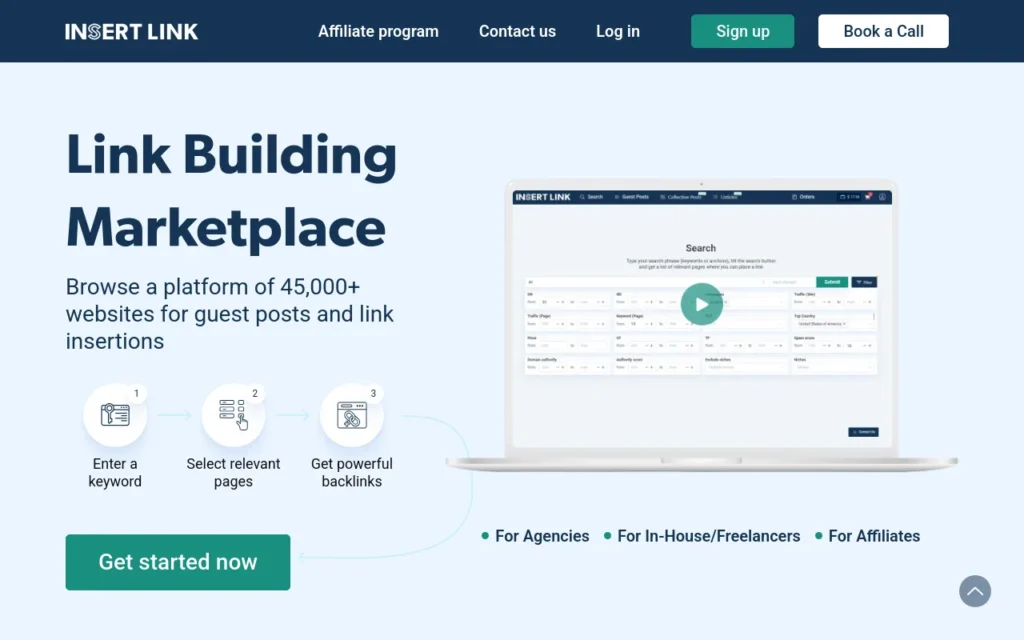 INSERT.LINK is a marketplace centered on link insertion (also known as niche edits/curated links): adding a backlink into an existing article rather than publishing a new guest post. The platform explains the method directly and leans into fast workflow plus agency features like white-label services and reporting.