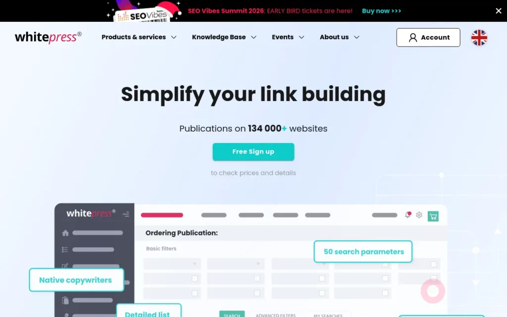 whitepress.com is a content marketing platform built around publishing articles across a large network of publishers. It highlights automation, a broad catalog, and a quality-scoring concept that is checked and assessed by its team (useful when you want an extra layer of curation beyond pure self-serve listings).